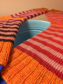 De är ett experiment, de är stickade i merinoull utan nylonförstärkning. Fast tå, häl och mudd är gjorda i ett mer hållbart garn med nylon i. Kanske går sockorna sönder under foten direkt, kanske håller de för varsam användning, kanske håller de förvånansvärt bra. Ja jag får se, man vet ju inte om man inte experimenterar och tar lite risker och jag ville så förtvivlat gärna kombinera rosa och orange. Jag tror inte att jag någonsin känt den lusten innan men nu gjorde jag det så rosa och orange fick det bli, även om det rosa är slitkänslig merino. Jag återkommer med resultat någongång när sockorna är ordentligt testade.